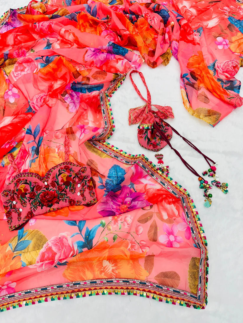 Includes: Saree with Embellished Border with ready blouse and Matching potli