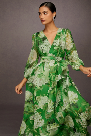 Flowing chiffon-like fabric with soft floral hydrangea print